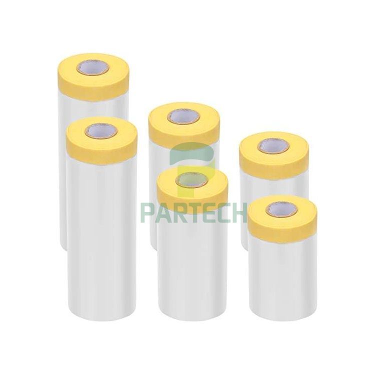 La película de enmascarar pregrabada es un producto que combina una película de plástico predoblada con cinta de enmascarar. La cinta se aplica en un borde de la película plástica y la película se puede desplegar, cortar a medida y luego aplicar sobre la superficie a proteger. La cinta sella los bordes de la película, creando una barrera para proteger las superficies de la pintura, la suciedad y los daños durante proyectos de pintura, remodelación o renovación.